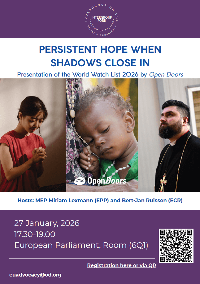 Op 27 januari presenteert Open Doors de ranglijst christenvervolging in het Europees Parlement op uitnodiging van Bert-Jan Ruissen. Naast Ruissen, spreekt ook de Zweedse directeur van Open Doors en enkele vervolgde christenen.