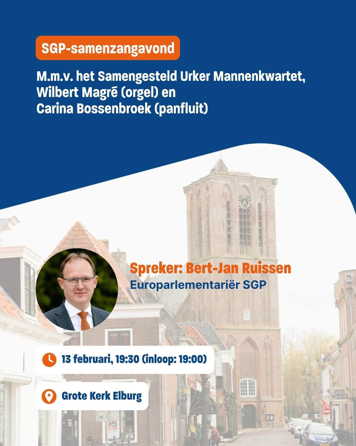 Bert-Jan Ruissen, Europarlementariër voor de SGP, zal een appelwoord spreken. De kerk is open om 19:00 uur en de toegang is gratis. Er zal een collecte worden gehouden voor de onkosten. U bent van harte welkom!