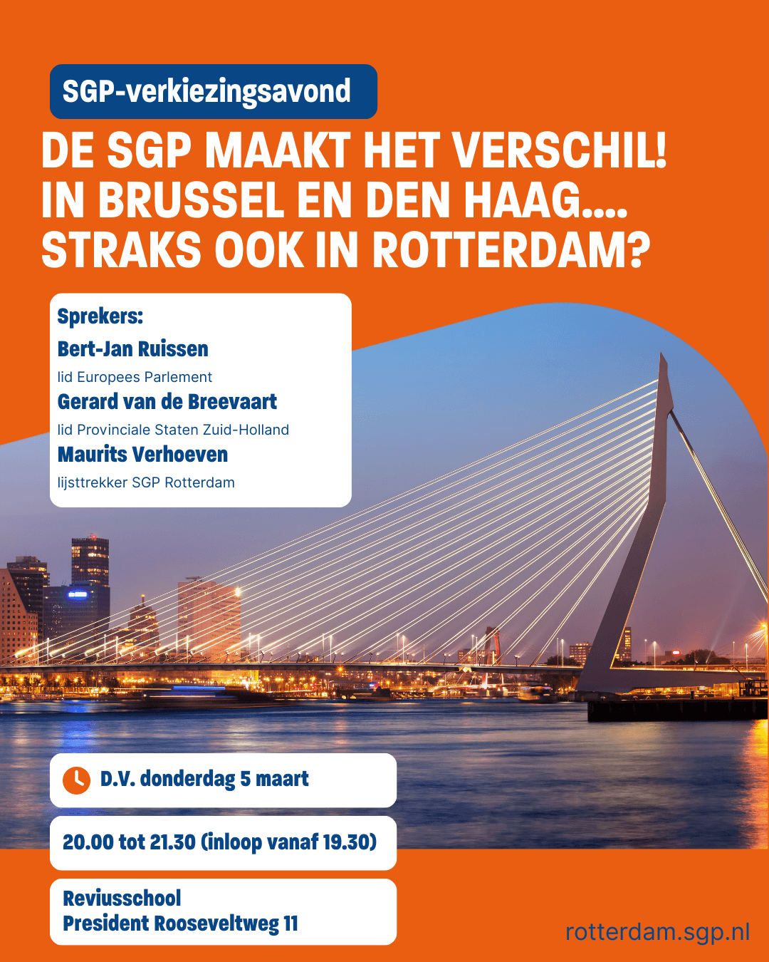 SGP Rotterdam doet in 2026 zelfstandig mee aan de gemeenteraadsverkiezingen - met Maurits Verhoeven als lijsttrekker. SGP-Europarlementariër Bert-Jan Ruissen spreekt op de verkiezingsavond van SGP Rotterdam op 5 maart, samen met Gerard van de Breevaart en Maurits Verhoeven. Welkom!